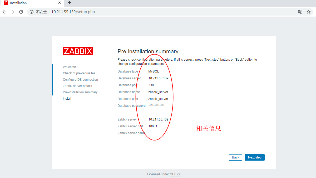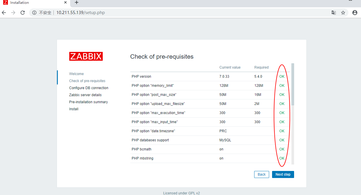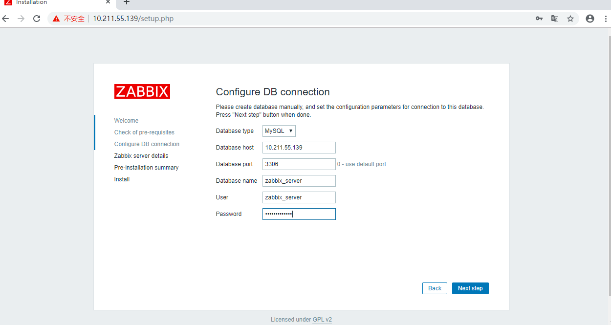 [root@wulaoer_zabbix01 conf]# pwd /home/wwwroot/default/conf [root@wulaoer_zabbix01 conf]# cp zabbix.conf.php.example zabbix.conf.php [root@wulaoer_zabbix01 conf]# vim zabbix.conf.php <?php // Zabbix GUI configuration file. global $DB, $HISTORY; $DB['TYPE'] = 'MYSQL'; $DB['SERVER'] = '10.211.55.139'; $DB['PORT'] = '3306'; $DB['DATABASE'] = 'zabbix_server'; $DB['USER'] = 'zabbix_server'; $DB['PASSWORD'] = 'zabbix_server'; // Schema name. Used for IBM DB2 and PostgreSQL. $DB['SCHEMA'] = ''; $ZBX_SERVER = 'localhost'; $ZBX_SERVER_PORT = '10051'; $ZBX_SERVER_NAME = ''; $IMAGE_FORMAT_DEFAULT = IMAGE_FORMAT_PNG; // Uncomment this block only if you are using Elasticsearch. // Elasticsearch url (can be string if same url is used for all types). //$HISTORY['url'] = [ // 'uint' => 'http://localhost:9200', // 'text' => 'http://localhost:9200' //]; // Value types stored in Elasticsearch. //$HISTORY['types'] = ['uint', 'text']; ~