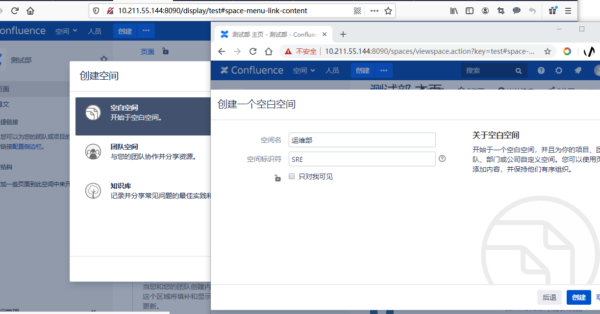 我们继续上一章的,点击开始后进入这个页面,会有一个欢迎视频,可以忽略点击底部的跳过,然后要求上传个人头像,这里也跳过,需要创建一个空间,这里我们创建运维部,开发部,产品部,测试部等,创建这几个部,为了测试后面的权限,建议跟着创建即可。第一次创建空间后跳过教程,不编辑内容,点击上面的空间下拉有一个创建空间选择空白空间,数据空间名称以及简称即可: