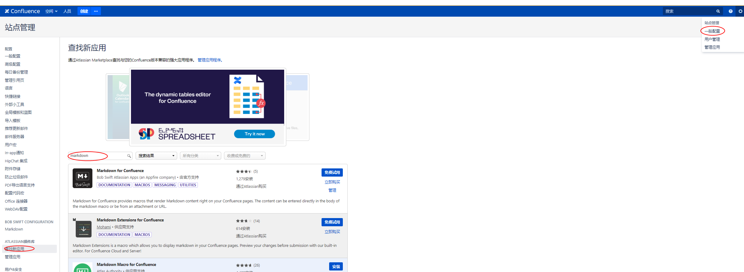 空间创建好了,我们先安装个插件markdown,markdown插件将助力confluence的文章编辑,markdown的好处,这里就不多说了。我周围的很多人都在使用markdown记录工作内容。下面是markdown的安装方法: