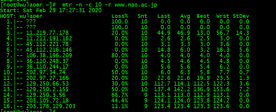 第一列:host显示的是IP地址和本机域名,这点和tracert很像; 第二列:loss%就是对应IP行的丢包率了,需要注意的是有些丢包是由于icmp的保护机制造成的,并不 代表真的丢包; 第三列:snt每秒发送数据包的数量,默认值是10,窝这里通过参数 -c来指定发送15个包; 第四列:Last显示的最近一次的返回时延; 第五列:Avg是平均值 这个应该是发送ping包的平均时延; 第六列:Best是最好或者说时延最短的; 第七列:Wrst是最差或者说时延最常的; 第八列:StDev是标准偏差,统计学名词,一种量度数据分布的分散程度标准,用以衡量数据值偏离算术平均值的程度。标准偏差越小,这些值偏离平均值就越少。