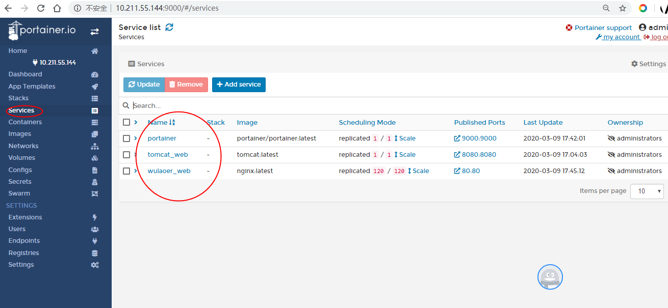 [root@server09 ~]# docker service create --name portainer --publish 9000:9000 --replicas=1 --constraint 'node.role == manager' --mount type=bind,source=/path/on/host/data,dst=/data portainer/portainer mp4r44jctqmol9gs06zvwd8g3 overall progress: 1 out of 1 tasks 1/1: running [==================================================>] verify: Service converged