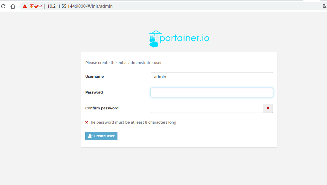 默认没有用户,需要自己创建,输入管理员admin的密码即可,第二次是验证。
