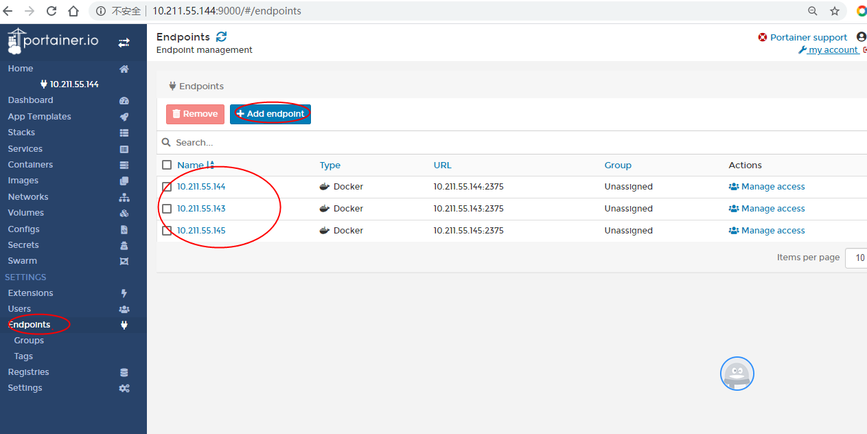 swarm集群管理页面portainer已经做好了,下面使用浏览器,访问Leader的IP加端口9000,查看一下: